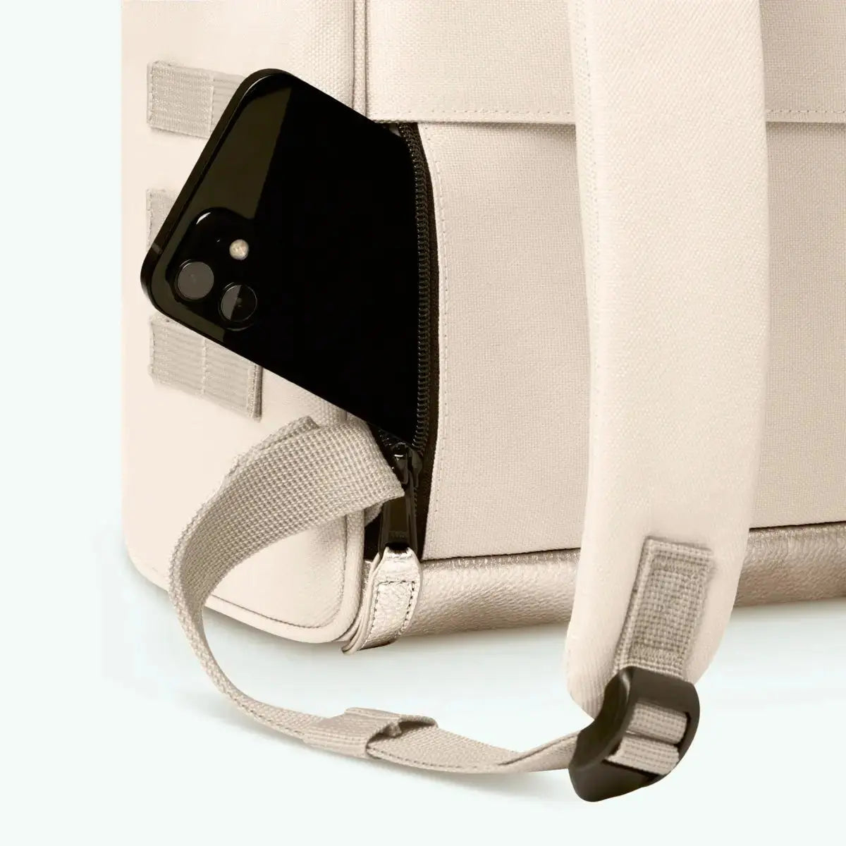 Le sac est vegan et conçu avec des matières résistantes, adaptées au quotidien. Son tissu est déperlant pour protéger tes affaires contre les petites intempéries, et sa composition privilégie des matériaux plus responsables.